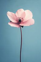 Een prachtige close-up van een delicate, roze bloem tegen een zachtblauwe achtergrond. De sierlijke, gebogen vorm van de bloemblaadjes en de sprankeling van het hart tonen de kwetsbaarheid en schoonheid van de natuur op een poëtische manier.