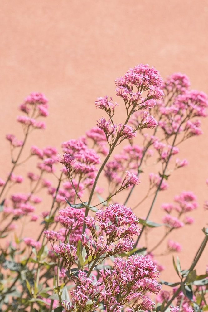 Op deze foto zie je roze bloemen tegen een perzik kleurige muur in Roussillon in de Franse Provence regio op een warme zomer dag.