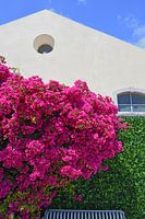 Op een terras boven op een heuvel in Lissabon, Portugal staat deze plant met roze bloesem.