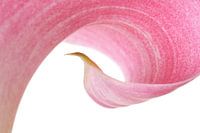 Een close-up van een roze Calla tegen witte achtergrond. Deze prachtige bloemen worden in allerlei kleuren gekweekt.
