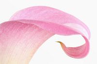 Een close-up van een roze Calla tegen witte achtergrond. Deze prachtige bloemen worden in allerlei kleuren gekweekt.