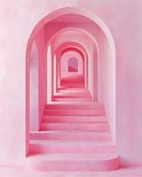 Deze hypnotiserende trap met zachte, roze bogen leidt de kijker naar een mysterieus onbekende bestemming, waardoor het verlangen naar avontuur en ontdekking wordt aangewakkerd.