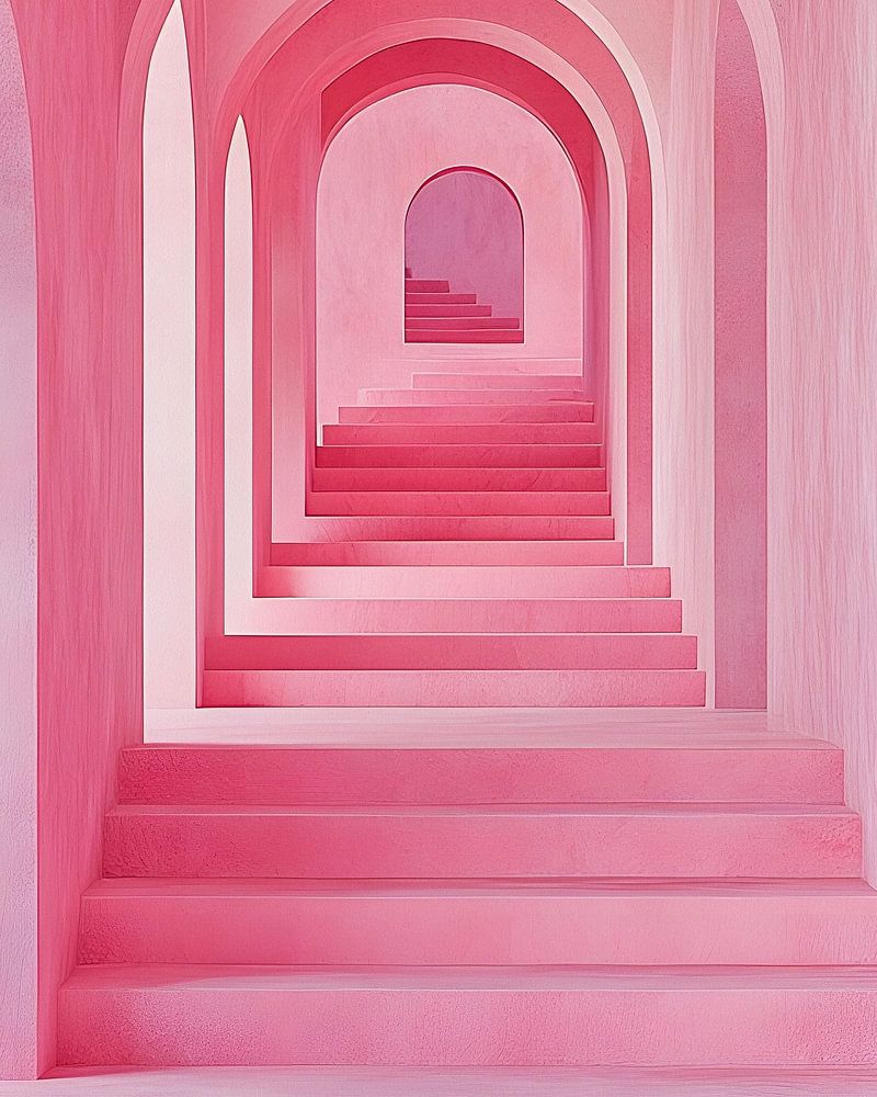 Deze hypnotiserende trap met zachte, roze bogen leidt de kijker naar een mysterieus onbekende bestemming, waardoor het verlangen naar avontuur en ontdekking wordt aangewakkerd.
