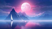 Het maanlicht reflecteert over het kalme wateroppervlak en creëert een pad van licht naar de horizon. De lucht is gevuld met een zachte roze gloed die de sterrenhemel sublimeert en de contouren van de…