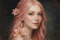 In dit beeld komt de zachte kracht van vrouwelijke schoonheid samen met de tederheid van de natuur. Haar roze lokken vloeien als een dromerige rivier, versierd met lelies. Haar blik is helder, bijna etherisch, alsof ze een geheim bewaart dat alleen de stilte kan onthullen. Het portret ademt een poëtische harmonie van fragiliteit en…