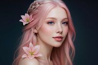 In dit beeld komt de zachte kracht van vrouwelijke schoonheid samen met de tederheid van de natuur. Haar roze lokken vloeien als een dromerige rivier, versierd met lelies. Haar blik is helder, bijna etherisch, alsof ze een geheim bewaart dat alleen de stilte kan onthullen. Het portret ademt een…