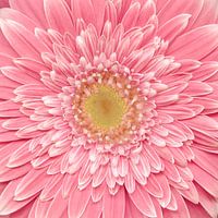 Ligtroze gerbera vanaf boven gefotografeerd. De bloem is beeldvullend vanaf boven in beeld gebracht wat een vervreemdend effect geeft