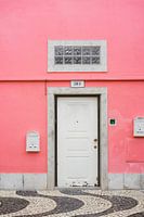 Een roze gevel met witte deur in het stadje Cascais in Portugal
