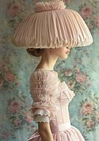 Pastelkleurige afbeelding van een vrouw in een poederroze jurk met een poederroze lampenkap op haar hoofd. Op de achtergrond rozen in de zelfde roze kleur op een lichtblauwe achtergrond. Lieflijk en apart. Het spreekt tot de verbeelding. Passend bij diverse stijlen en trends, waaronder Fantasie, Modern Abstract, Grandeur chique. Artist: Bianca ter Riet