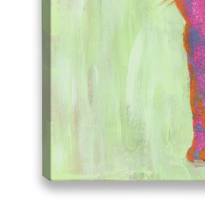 Roze kat en oranje vogel is een abstract acrylschilderij in portretformaat geschilderd door de kunstenaar Karen Kaspar. Een roze kat zit voor een abstracte lichtgroene achtergrond en kijkt linksachter in de verte. Daar zit een klein vogeltje op een tak en zingt zijn lied. De kat lijkt aandachtig naar de vogel te luisteren.