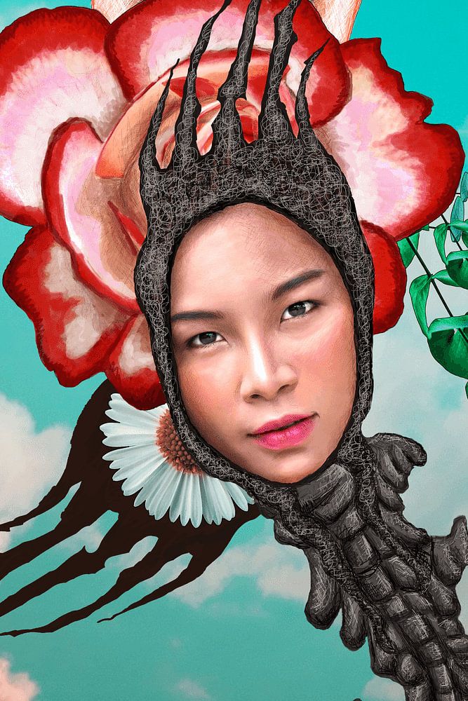 Mijn werken ontstaan deels op intuïtie en deels op verstandelijke overwegingen. De foto's bij elkaar zoeken en er vervolgens in Photoshop een geheel van maken is elke keer weer een uitdaging. Van de foto's worden delen gebruikt, het gezicht is bijvoorbeeld digitaal uit een foto geknipt. De flamingo's zijn met digitale potloden en penselen levendiger gemaakt. De originele foto was nogal overbelicht en had dus niet veel detail van zichzelf.