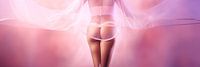 Een schilderij dat de schoonheid van het vrouwelijk lichaam viert, met een focus op een delicaat lingerie setje. en deels naakt. De zachte tinten en subtiele schaduwen brengen een gevoel van sereniteit en bewondering over.