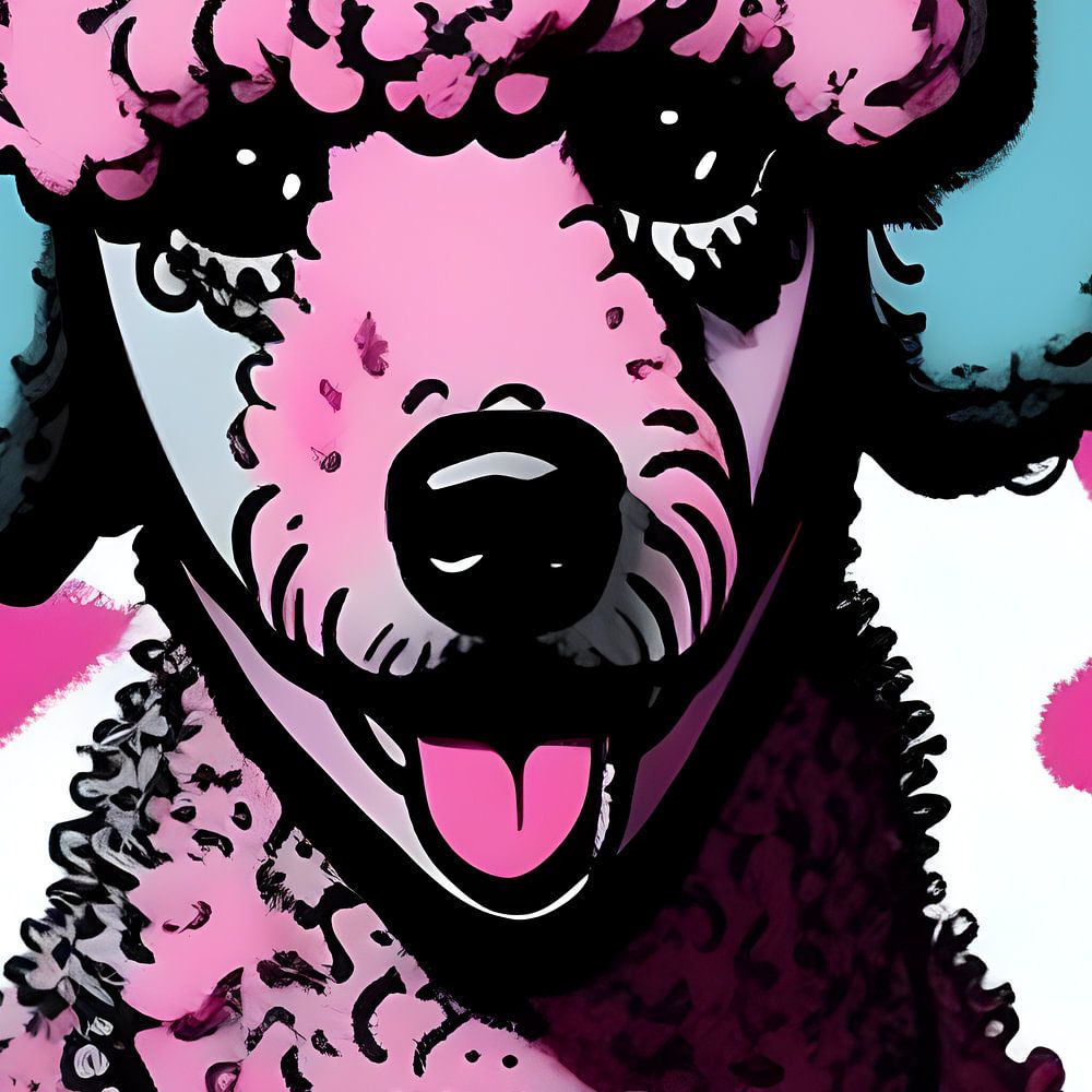 De achtergrond is eenvoudig maar doeltreffend, met hardroze vlekken die de aandacht naar de poedel trekken. De lichtblauwe oortjes van de poedel vormen een speelse contrast, waardoor de hele compositie in balans is.