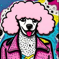 Stel je je dit voor: Een getekende witte poedel met een flitsend roze jasje dat zijn stoere karakter benadrukt. Zijn kop is versierd met schattige roze krullen die zijn speelse kant laten zien. De achtergrond is een explosie van kleuren die zowel in een kinderkamer als in een stijlvol zwart-wit interieur met popart invloeden tot hun…