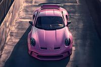 Een roze Porsche 911 GT3, staat en perfect gestroomlijnd, straalt een tijdloze schoonheid uit. De verf reflecteert het licht subtiel, onthullend hoe de elegante rondingen naadloos overgaan in scherpe, aerodynamische details. Elke lijn lijkt met precisie ontworpen om snelheid en kracht uit te drukken, zelfs in stilstand. De balans tussen luxe en sportiviteit maakt deze auto een visueel meesterwerk.