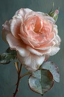 Deze prachtige afbeelding van een roze roos in bloei is een lust voor het oog en een eerbetoon aan de schoonheid van de natuur. De delicate bloemblaadjes zijn perfect gevormd en de zachte kleuren zijn rustgevend en sereen. De dauwdruppels op de blaadjes voegen een vleugje magie toe aan het beeld, waardoor het lijkt alsof de roos net is ontwaakt uit een lange slaap. Dit kunstwerk is een perfecte aanvulling op elke kamer en zal zeker een gevoel van vrede en rust brengen.