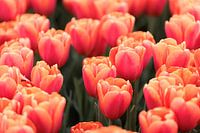 Deze close-up van een veld vol roze / oranje tulpen legt de energie van het voorjaar vast in een explosie van kleur. De tulpen zijn vol in bloei, hun bloemblaadjes opengevouwen in warme tinten van rood en oranje. De compositie vult het hele beeldvlak met bloemvormen, waardoor een patroon ontstaat dat zowel natuurlijk als grafisch oogt.…