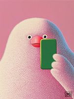 Roze Vogel - Dit dierenschilderij toont een groot roze vogelachtig wezen dat verbaasd naar een groene smartphone kijkt, tegen een zachtroze achtergrond.
