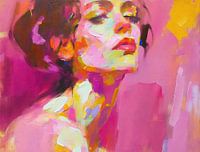 Roze Vrouw | Vrouw Roze - Dit is een abstract vrouwen schilderij waar krachtige penseelstreken en levendige kleuren zoals roze en geel de emotie en expressie van de vrouw verbeelden.