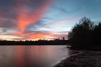 Deze foto toont een prachtige roze zonsondergang bij de afgraving in Drunen. De lucht is gevuld met warme, pastelkleurige tinten, waaronder roze, oranje en paars. De zon is net verdwenen achter de bomen langs de oever van het meer en verlicht de wolken met een roze gloed. Het was een mooie beleving.