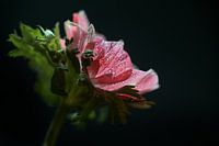 Roze anemoonbloem met waterdruppels in de bloemblaadjes tegen een zwarte achtergrond, close-up, kopieerruimte, geselecteerde focus, kleine scherptediepte