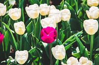 Een eenzame roze tulp, temidden van een veld vol witte, zachtgele tulpen. Foto gemaakt in de lente.
