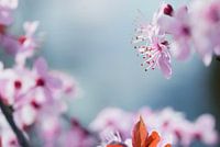 De bloesem van de kerspruim 'Nigra' in volle bloei, met zijn prachtige roze blaadjes en uitstekende meeldraden.