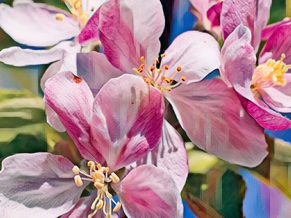 Digitale bewerking van een close-up van wit-roze bloesem.