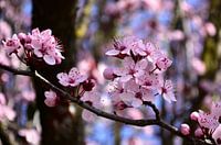 Een foto van een tak met roze bloesem. Deze boom staat volop te bloeien in de vroege lentezon, tegen een blauwe lucht.