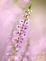 Omgeven door roze, de heidebloemetjes. Als je goed kijkt zie je de bordeauxrode stampers. Dit bloemetje heeft zoveel details, bijna een romantisch beeld. Dat maakt macrofotografie zo leuk. Vlinders zijn er dol op. Jammer dat ze zo kort bloeien.