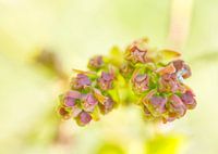 Roze bosbessenknoppen met groene pastel - een grote tros kleine roze bosbessenknoppen. Het is een vroege zondagse lentemorgen en de kleine bosbessenknoppen koesteren zich in de warme ochtendzon. De achtergrond is zacht, warm crème en pastelgroen. Een prachtige macrofotografie weergave van de bosbessenbloesem. Het gevoel is fris, zacht en romantisch.