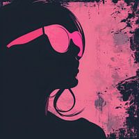 Een poster in roze en zwart met daarop een vrouwengezicht met een zonnebril.