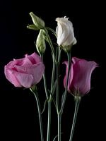Koop dit bloemen kunstwerk Roze en witte prairie gentianen op zwart van Carine Belzon op canvas, aluminium dibond, (ingelijste) fotoprint, behang en ArtFrame, op maat geprint in Fine-Art kwaliteit.