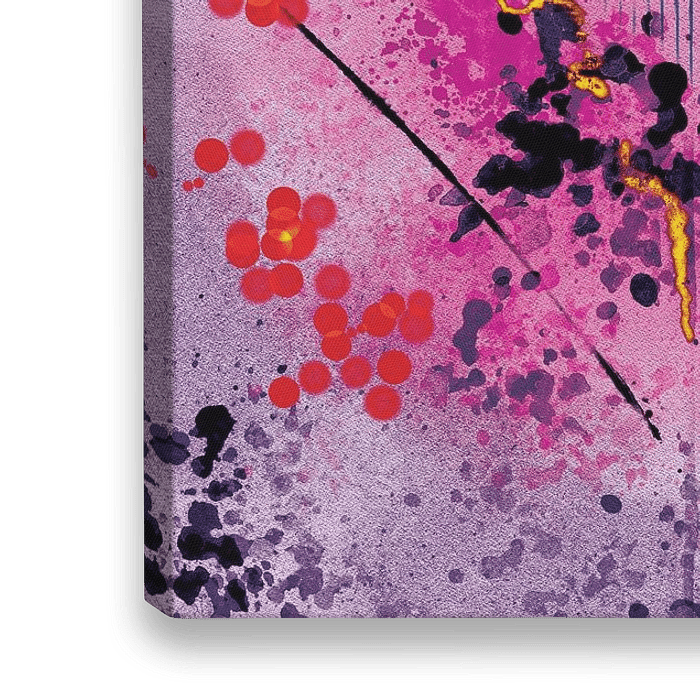 Het is een multimedia abstract schilderij, de hoofdkleuren zijn roze en rood, goud en bruin.