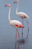 Twee roze flamingo's (Phoenicopterus roseus) in ondiep water in de Camargue in Frankrijk.