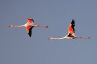 Roze flamingo's (Phoenicopterus roseus) tijdens de vlucht boven een lagune in de Camargue, Frankrijk.