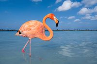 De flamingo, gehuld in zijn kenmerkende roze en zalmkleurige veren, staat trots in het ondiepe water, als een symbool van gratie te midden van de natuurlijke pracht van Aruba. De intensiteit van zijn kleuren contrasteert met het heldere blauw van de omringende zee en de hemel, waardoor een visueel spektakel van levendige tonen ontstaat