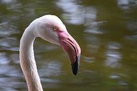 Een portret van een roze flamingo die bij de waterkant zit. Deze vogels zijn jaarlijks in het wild te zien in Nederland in de provincie Zeeland.