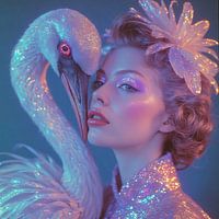 Dit etherische kunstwerk legt een surrealistisch moment van intimiteit vast tussen een vrouw en een kraanvogel, afgebeeld in een droomachtig kleurenpalet van glinsterend roze, paars en iriserend blauw. De compositie straalt een gevoel van zachte verbondenheid en fantastische elegantie uit, een samensmelting van mode, natuur en…