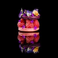 A really beautiful pink macaron with sweet and healthy raspberries. A macaron is an airy and colorful delicacy. Its an tasty dessert or sweetness. This picture has a very luxery feeling. It will be great to place this image in a michelstar restaurant or a bakery or patissier. But what about a high gloss print in the office, workspace, kitchen, livingroom or outdoorkitchen, De colors you can see are purple, pink and a little but of orange. It has some nice eatable flowers on top. Check also the littel details like the small purple flowers around the raspberry.