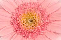 Macrofoto van een prachtige roze gerbera met een waterdruppel precies in het midden. De foto heeft een frisse en zachte uitstraling. De waterdruppel is scherp gefotografeerd waardoor je alle details van het hart van de bloem vergroot terugziet in de druppel. De foto geeft een zomers gevoel.