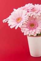 Roze gerbera op rode achtergrond van Ivonne Wierink
