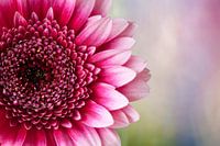 Close-up van een roze gerbera met een kleurrijke zachte achtergrond.