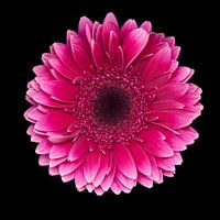 Deze felroze gerbera spat van het beeld af. De uitgesproken kleur neemt vanuit het hart van de bloem in kleur af. Het bovenaanzicht laat de bloem van een andere kant zien.