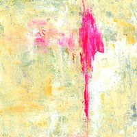Felle strepen felroze doorsnijden een veld van gedempte tinten lichtgeel, oker en wit, waardoor een scherp contrast ontstaat.