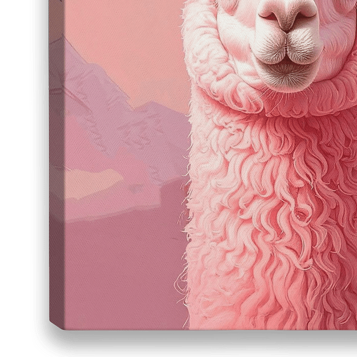 Een roze gekke alpaca, met kerstballen op zijn hoofd, staat in een roze landschap met op de achtergrond de bergen. Het heeft gesneeuwd en het is koud, maar de alpaca heeft een dikke vacht dus heeft geen last van de kou. Het beeld is met behulp van ai gegenereerd.