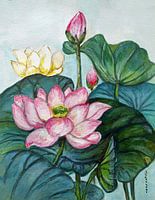 Acrylinkt schilderij van een roze lotus , de tekening is op Chinese tekeningen kunst geïnspireerd. In Nederland noemen wij deze bloem, waterlelie en zij bloeit in de zomer in vele kleuren.