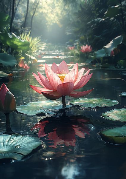 Sierlijk en sereen drijft de waterlelie moeiteloos, een symbool van zuiverheid en rust. Geworteld in de diepte, stijgt ze naar de oppervlakte, bloeiend in stille elegantie - een herinnering aan veerkracht en schoonheid in zelfs het stilste water.
