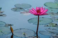 Deze foto van een roze lotusbloem in een vijver met lotusbladeren zorgt voor een prettige rustieke sfeer in de ruimte.