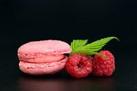 Tegen een donkere achtergrond ligt een roze macaron met frambozen
